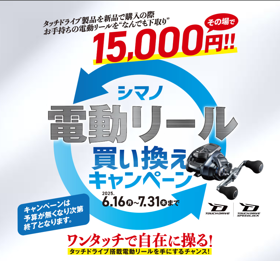 タッチドライブ電動リールを購入の際に、お手持ちの不要な電動リールを下取りとして15,000円(税込)を値引き!!