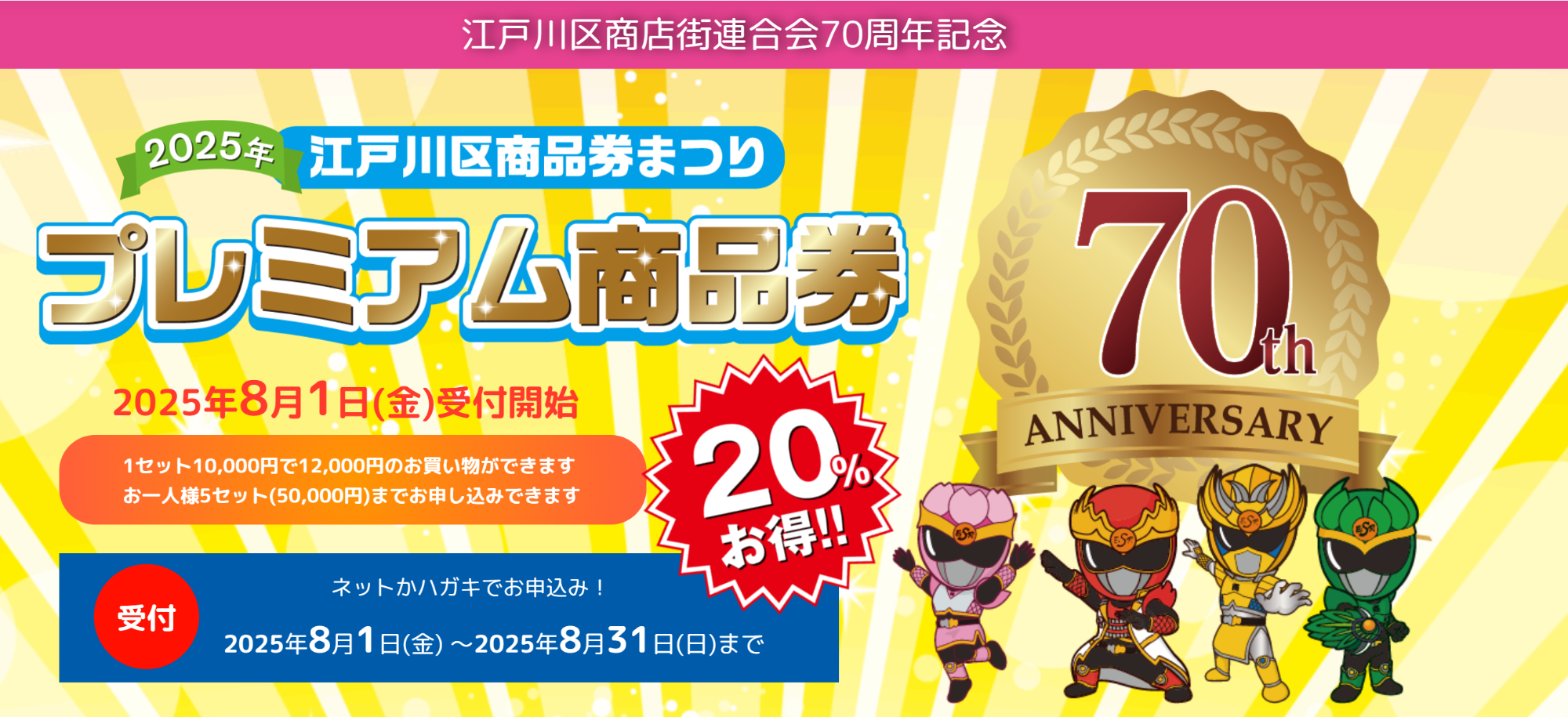 江戸川区商店街連合会70周年を記念して、購入額に20%も上乗せされる「江戸川区プレミアム付商品券」が発行されます! もちろん、当店「つり吉」のすべての商品でご利用可能です!