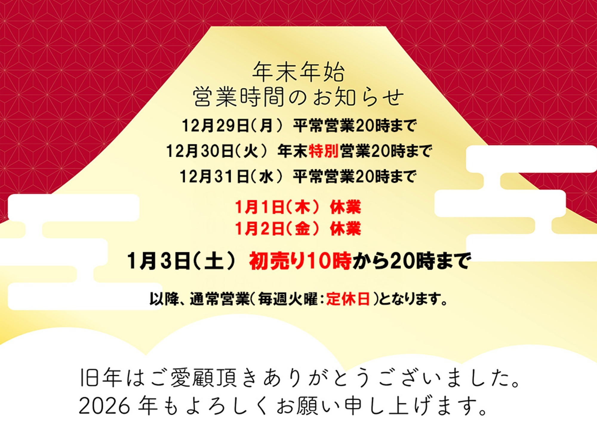 年明けは1月1日(元日)・2日はお休みを頂戴いたします。